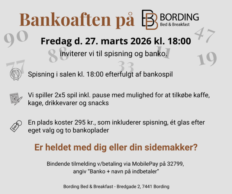 Herunder finder du vores fremtidige arrangementer og andre spændende nyheder på Bording B&B. Følg med på vores Facebookside for invitationer og flere informationer om arrangementerne. Klik her, og find vores Facebookside.